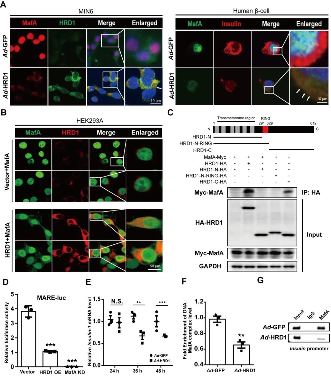 在(zai)HRD1過(guo)(guo)表(biao)(biao)達時,在(zai)MIN6細(xi)胞(bao)(bao)及HEK293A細(xi)胞(bao)(bao),MafA和(he)HRD1定位(wei)于(yu)細(xi)胞(bao)(bao)核(he)(he)周圍而不是細(xi)胞(bao)(bao)核(he)(he),主要在(zai)ER區域共定位(wei),表(biao)(biao)明(ming)HRD1在(zai)ER附近捕捉MafA,通過(guo)(guo)其胞(bao)(bao)質C端結(jie)構域與(yu)胞(bao)(bao)質MafA相互作(zuo)用(yong)。熒光(guang)素(su)酶報告基因檢(jian)測(ce),作(zuo)者發現(xian)HRD1過(guo)(guo)表(biao)(biao)達顯著(zhu)降(jiang)低MafA的(de)核(he)(he)轉錄調(diao)控(kong)活(huo)性(xing),qPCR和(he)ChIP-qPCR結(jie)果證實胰島(dao)素(su)是MafA調(diao)控(kong)的(de)主要基因。HRD1的(de)敲低部分(fen)挽救了糖脂毒性(xing)條件下核(he)(he)MafA的(de)減少,表(biao)(biao)明(ming)HRD1的(de)降(jiang)低足以維持核(he)(he)MafA水(shui)平(ping)。HRD1不僅調(diao)節細(xi)胞(bao)(bao)內MafA的(de)數量,而且調(diao)節其在(zai)β細(xi)胞(bao)(bao)中的(de)定位(wei)。