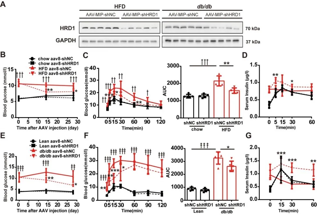 隨后作者將AAV8-MIP-shHRD1(維真生物提供)注射入HFD飼喂(wei)的糖(tang)(tang)尿病(bing)小(xiao)(xiao)鼠胰(yi)腺導管,2周后,糖(tang)(tang)尿病(bing)小(xiao)(xiao)鼠空(kong)腹血糖(tang)(tang)明(ming)顯(xian)下降(jiang)。4周后,糖(tang)(tang)耐量試驗(Intraperitoneal Glucose Tolerance Test,IPGTT)結果(guo)顯(xian)示糖(tang)(tang)尿病(bing)小(xiao)(xiao)鼠血糖(tang)(tang)反應(ying)和(he)血清胰(yi)島(dao)素(su)水平明(ming)顯(xian)改善(shan)。AAV-shHRD1注射db/db小(xiao)(xiao)鼠的葡萄糖(tang)(tang)反應(ying)也有改善(shan)。綜上(shang)結果(guo)表明(ming)HRD1在胰(yi)島(dao)β細胞功(gong)能障礙(ai)和(he)糖(tang)(tang)尿病(bing)中發揮重要作用(yong)。