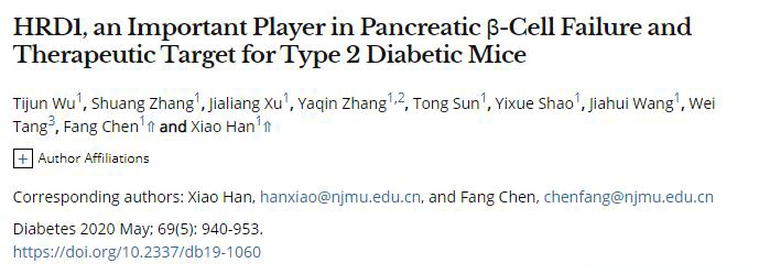 2020年,南京醫科大學韓曉教授研究團隊在《Diabetes 》上發表的“HRD1 an important player in pancreatic β-cell failure and therapeutic target for type 2 diabetic mice”論文研究表明胰島β細胞中HRD1的特異性過表達引發胰島素分泌受損,最終導致嚴重高血糖。該研究成果發現HRD1可作為2型糖尿病的治療靶點,使人類在治療T2D方面又取得新進展!