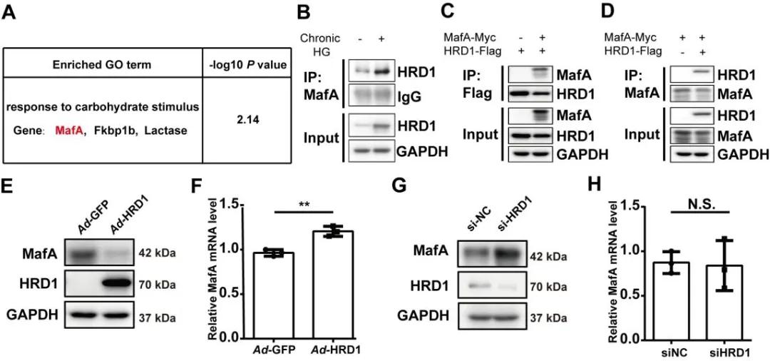 為了確定HRD1高(gao)表達(da)引起(qi)的(de)(de)β細(xi)(xi)胞胰島素分泌(mi)受損的(de)(de)分子(zi)基礎,作者通過質譜分析研究Ad-HRD1 或 Ad-GFP感(gan)染后MIN6細(xi)(xi)胞HRD1的(de)(de)結(jie)合蛋白(bai),發現其(qi)中(zhong)一(yi)種(zhong)蛋白(bai)細(xi)(xi)胞特異性轉錄因(yin)子(zi)MafA與碳水化合物刺激反(fan)應有關,免疫沉淀分析證實HRD1和(he)MafA共存于沉淀復合物中(zhong),當HRD1高(gao)表達(da)時,HRD1和(he)MafA的(de)(de)相互(hu)作用增強,在(zai)人胰島證實HRD1和(he)MafA之(zhi)間(jian)呈負相關。MafA是β細(xi)(xi)胞功能和(he)健康的(de)(de)積(ji)極指標,HRD1過表達(da)在(zai)翻譯水平而非(fei)轉錄水平上(shang)顯著(zhu)降低(di)了MafA的(de)(de)表達(da)。