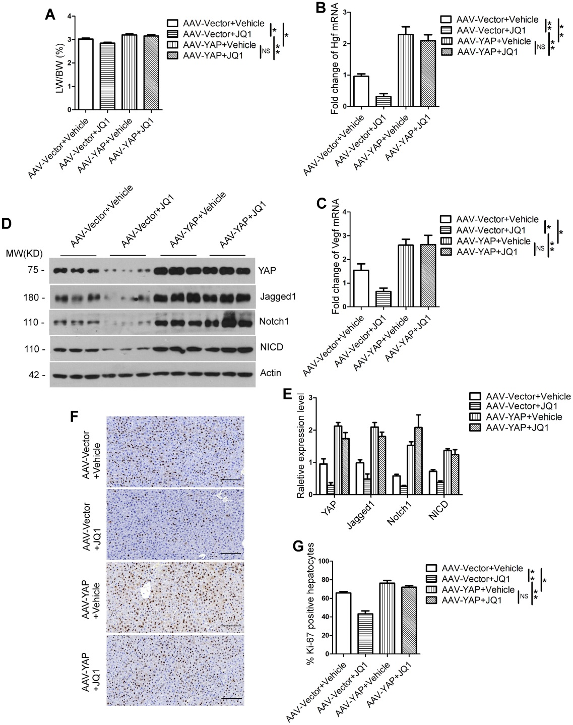 腹腔注射表達YAP的AAV9過表達載體,發現YAP顯著高表達。與YAP非過表達組相比,YAP過表達后小鼠LW/BW比、肝再生的兩個關鍵調節因子Hgf和Vegf表達水平及Notch信號通路相關蛋白(Jagged1, Notch1和NICD)表達水平均明顯升高。不僅如此,Ki-67(細胞增殖指數)陽性肝細胞數量也遠遠高于YAP非過表達組。這些數據說明,小鼠肝臟中YAP的過表達可以挽救BET蛋白抑制劑對肝再生的損傷。