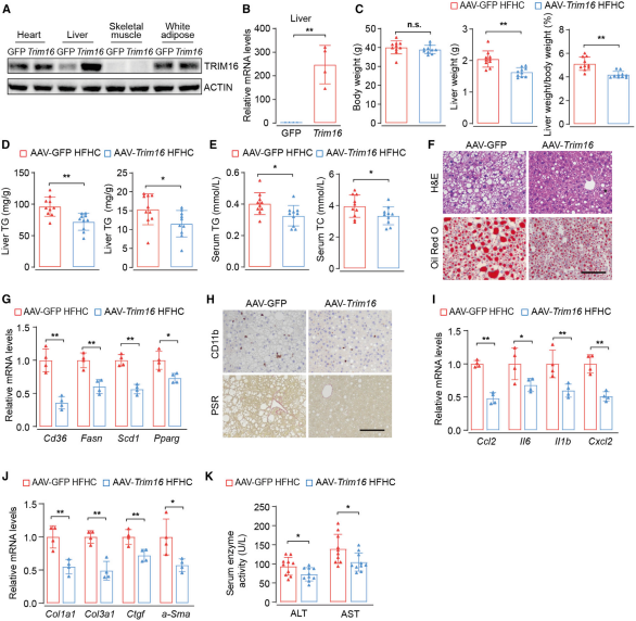 如圖2所示,AAV8-TRIM16注射后,Western blot和qPCR分析均表明TRIM16在小鼠肝臟中過表達成功。與對照組(AAV-GFP)相比,注射AAV8-TRIM16的小(xiao)鼠(shu)在經HFHC喂養(yang)16周后,肝(gan)臟重量(liang)和肝(gan)體(ti)重比明(ming)顯降低,此外,TRIM16過表達顯著減緩(huan)了HFHC喂養(yang)小(xiao)鼠(shu)肝(gan)臟中(zhong)的脂質積聚、炎癥、纖維化(hua)和肝(gan)損傷。