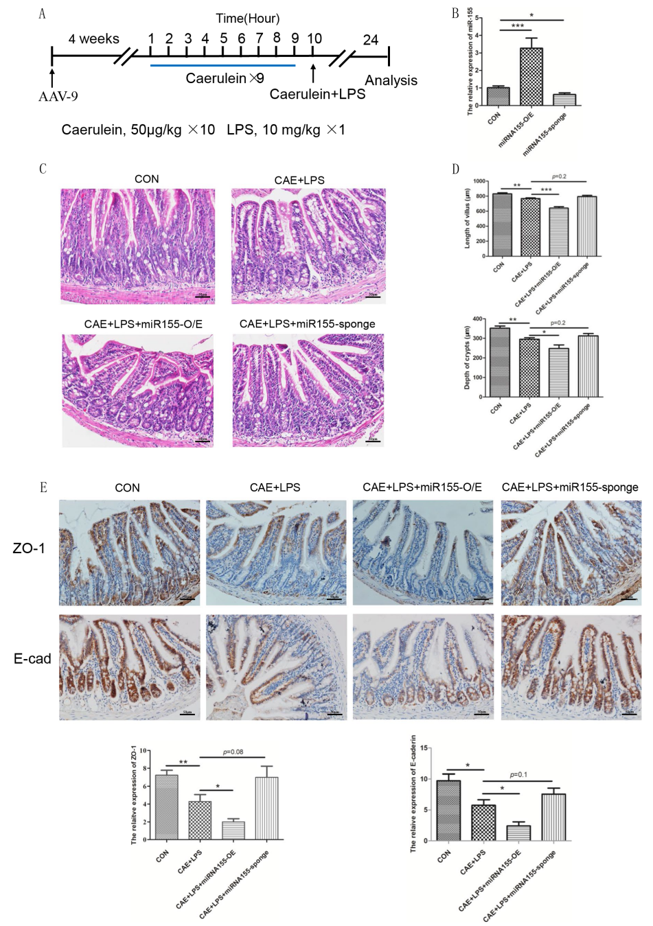 為檢測miR155在SAP小(xiao)鼠腸(chang)道功能破(po)壞(huai)中(zhong)的(de)(de)作(zuo)用,研究人員先利用AAV9載體(ti)對miR155進行了(le)過(guo)表(biao)達(da)及干擾處(chu)理,而后建立了(le)SAP小(xiao)鼠模型。檢測結果發現注(zhu)射AAV9-miR155的(de)(de)小(xiao)鼠小(xiao)腸(chang)中(zhong)miR155的(de)(de)表(biao)達(da)量(liang)(liang)顯著升高,注(zhu)射AAV9-miR155 sponge后miR155表(biao)達(da)量(liang)(liang)明(ming)顯下降(jiang)。miR155過(guo)度表(biao)達(da)的(de)(de)SAP小(xiao)鼠小(xiao)腸(chang)組織損傷(shang)顯著增加,免(mian)疫組化檢測發現miR155的(de)(de)過(guo)表(biao)達(da)明(ming)顯加劇(ju)了(le)腸(chang)道屏障(zhang)標志物(wu)ZO-1和E-cad的(de)(de)蛋白表(biao)達(da)水(shui)平的(de)(de)下調(diao)。這些結果表(biao)明(ming),miR155可(ke)能加劇(ju)了(le)腸(chang)道屏障(zhang)的(de)(de)破(po)壞(huai),下調(diao)miR155的(de)(de)表(biao)達(da)可(ke)能對腸(chang)道屏障(zhang)起(qi)到保護作(zuo)用。