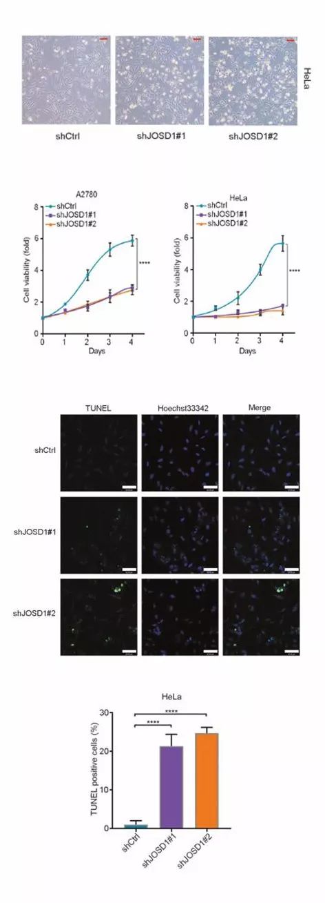 研究者通過構建體內獲得性耐藥的模型,檢測到JOSD1基因在這一過程中上調最為明顯,預示了其在耐藥中的重要作用。為進一步驗證JOSD1在婦科腫瘤中的功能作用,研究者通過體外實驗,在婦科腫瘤細胞系中敲降JOSD1的表達。