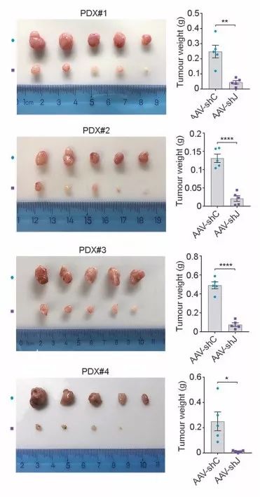 圖3.四例卵巢癌PDX模型中敲降JOSD1表達后能顯著抑制腫瘤生長
