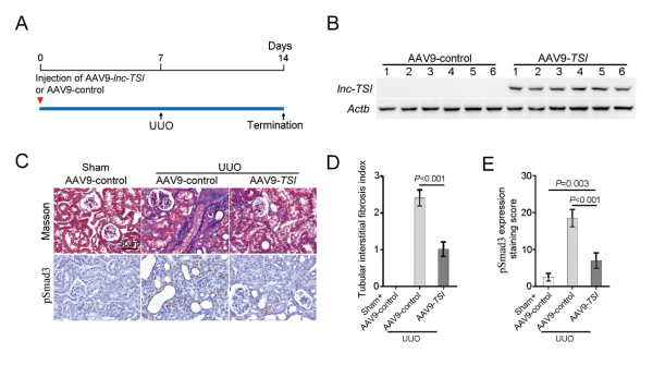 圖2、腎(shen)(shen)臟組織中(zhong)檢測(ce)lnc-TSI的表(biao)達(da)(da)和UUO所(suo)致的腎(shen)(shen)間質纖(xian)(xian)維化(hua)病(bing)變程(cheng)度。Northern blot結果顯示,通過(guo)注射腺相關病(bing)毒AAV9-TSI可(ke)以成功在小(xiao)鼠腎(shen)(shen)臟中(zhong)表(biao)達(da)(da)lnc-TSI(2 B)。并且,在小(xiao)鼠腎(shen)(shen)臟中(zhong)特異過(guo)表(biao)達(da)(da)lnc-TSI可(ke)以有效減輕單側(ce)輸(shu)尿管結扎(zha)(UUO)所(suo)致的腎(shen)(shen)間質纖(xian)(xian)維化(hua)(2 C),表(biao)現為腎(shen)(shen)間質纖(xian)(xian)維化(hua)評(ping)分(fen)(TIF index)降低(2D)和腎(shen)(shen)小(xiao)管中(zhong)pSmad3蛋(dan)白的表(biao)達(da)(da)下降(2 E)。
