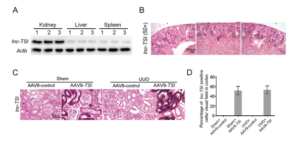 圖1、 lnc-TSI在腎臟(zang)組(zu)織中(zhong)的過表達。 Northern blot實驗(yan)證明(ming),這種感染方法可以使(shi)lnc-TSI主(zhu)要表達于腎臟(zang)中(zhong)(1A)。同時,使(shi)用RNA原(yuan)位(wei)雜交發現,病毒感染使(shi)lnc-TSI主(zhu)要表達于腎皮質的腎小管上皮細胞(bao)中(zhong)(1B),皮質中(zhong)被感染成功的細胞(bao)百分(fen)比約為40-60%(1C&1D)。