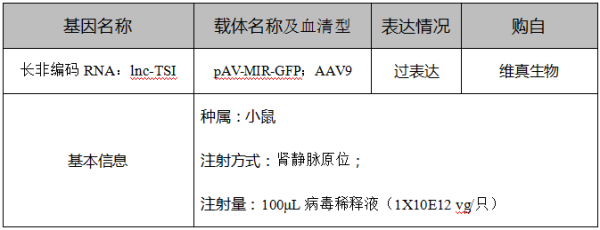 研究者采用(yong)單側輸尿管(guan)結扎(Unilateral Ureteral Obstruction, UUO)的(de)(de)方法,于術前一周進(jin)行小(xiao)鼠(shu)腎(shen)靜(jing)脈(mo)原位注射。用(yong)生理鹽水將10μL腺相關(guan)病毒(du)(AAV9-TSI,1×10E14 vg/mL)稀釋至100μL體(ti)(ti)積(ji),每只(zhi)小(xiao)鼠(shu)使(shi)用(yong)100μL病毒(du)稀釋液,于造模一周后(hou)(hou)處(chu)死(si)小(xiao)鼠(shu)。具(ju)體(ti)(ti)操作如下:使(shi)用(yong)動脈(mo)夾夾閉小(xiao)鼠(shu)的(de)(de)腎(shen)靜(jing)脈(mo),并用(yong)31G的(de)(de)針頭注射進(jin)入(ru)腎(shen)靜(jing)脈(mo),保持夾閉15分鐘(zhong)后(hou)(hou)松開。