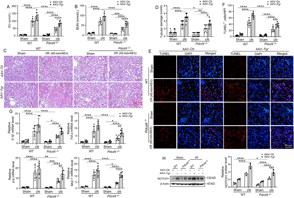 如圖3所示,FGR的過表達消除了Pdcd4-/-缺血小鼠的腎損傷減輕癥狀,具體表現為血清肌酐SCr和血尿素氮BUN升高,腎形態損傷惡化,細胞死亡、炎癥反應以及巨噬細胞、中性粒細胞浸潤增強。重要的是,FGR的過表達還逆轉了Pdcd4-/-缺血小鼠(shu)NOTCH1的(de)下(xia)調。上述結(jie)果(guo)表明Fgr在(zai)AKI中是PDCD4和炎癥反應(ying)的(de)關鍵調節因子。