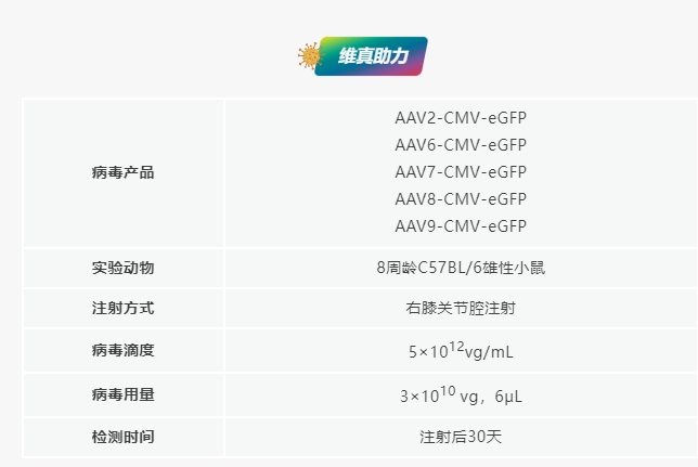 溫馨提示:以上來(lai)自于文(wen)(wen)獻(xian)(xian)報道,AAV在骨骼系統中的轉導(dao)效(xiao)率應結合(he)血清型、啟動(dong)子(zi)及注射方(fang)式等多方(fang)面綜合(he)考慮,建議在進行實驗(yan)前(qian)根據具體想要感染的組織細胞查閱相關(guan)文(wen)(wen)獻(xian)(xian)并進行預實驗(yan)的摸索(suo)。