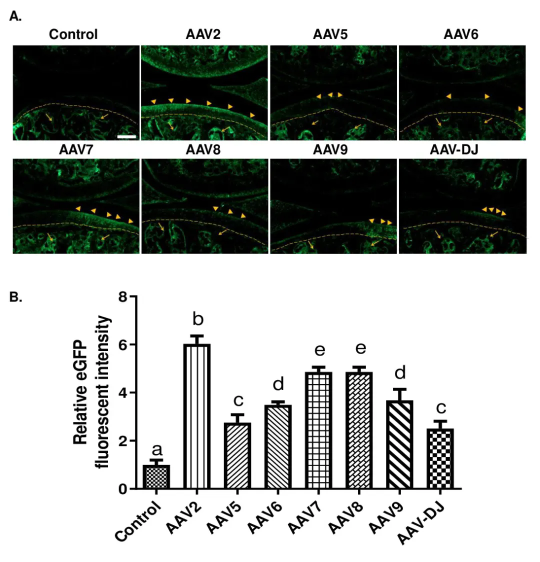 不同AAV血清(qing)型在(zai)小鼠(shu)軟骨組織中的轉(zhuan)導效率(lv)比(bi)較