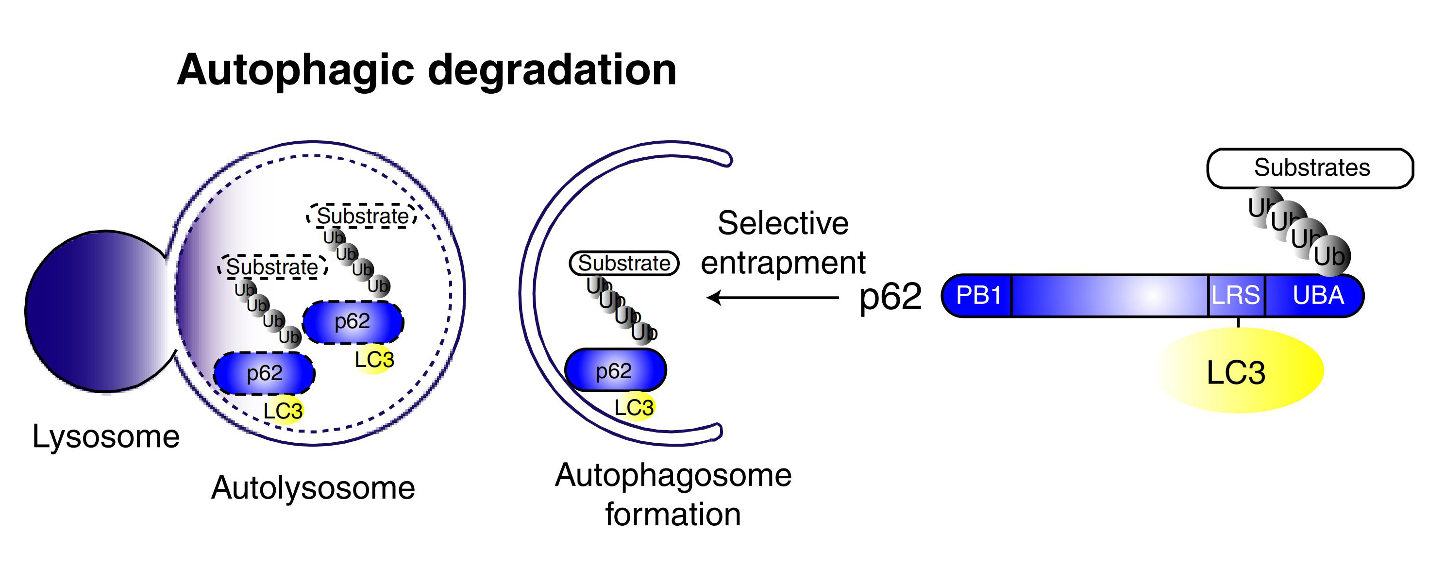 ② 除LC3外,其他細胞自噬底物表達量的變化也可以用于監測細胞自噬流。其中,p62是研究廣泛的一個細胞自噬底物。p62(也稱為SQSTM1蛋白),由以下三個結構域組成:N端Phox和Bem1 (PB1)結構域、鋅指結構域和C端泛素相關(UBA)結構域。研究表明,p62蛋白鋅指結構域和UBA結構域之間的連接區域(LRS區域)負責與細胞自噬受體蛋白 Atg8/LC3結合,UBA結構域負責招募泛素化蛋白。在細胞自噬體形成過程中,p62作為鏈接LC3和聚泛素化蛋白之間的橋梁,被選擇性地包裹進細胞自噬體,之后被細胞自噬溶酶體中的蛋白水解酶將其降解(圖8),所以p62蛋白的表達量與細胞自噬活性呈現負相關。因此,利用Western Blot檢測p62蛋白的表達量也可以用來評價細胞自噬水平(圖7)。