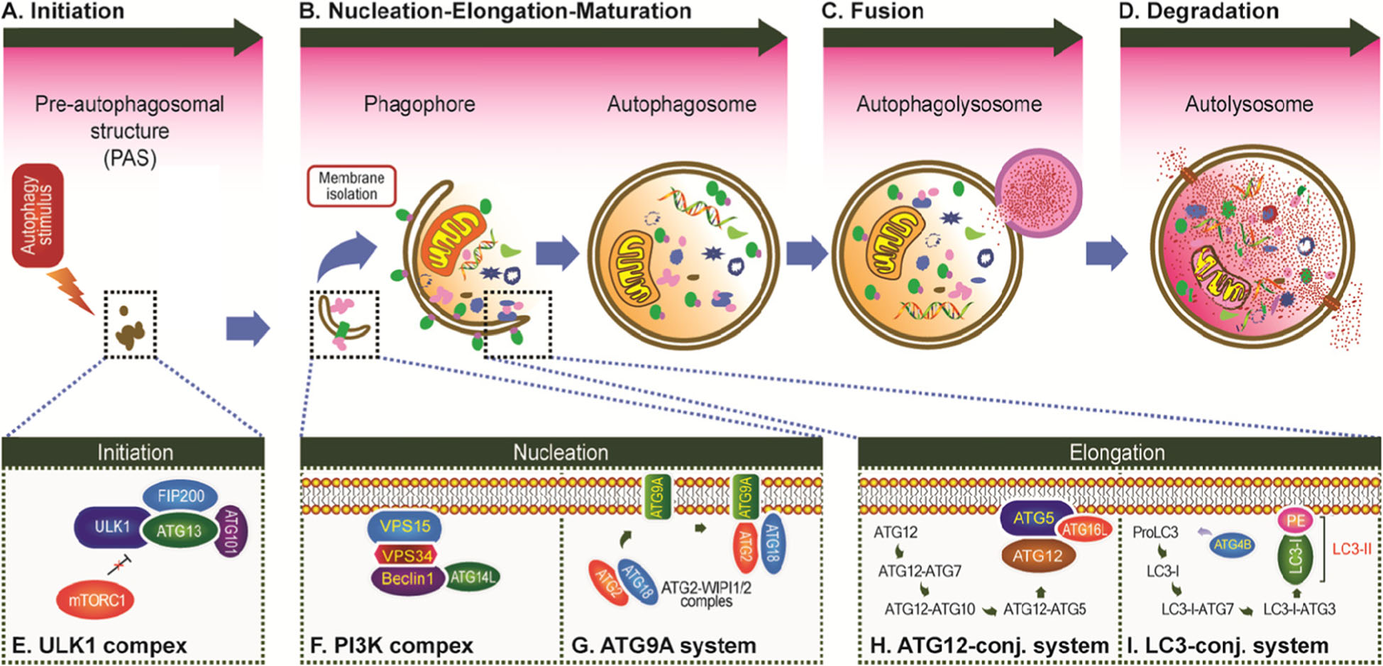 ①細胞自噬的起始 在細胞自噬誘導信號的調控下,ULK1復合物和多種ATG蛋白被活化,并定位于前細胞自噬體處。