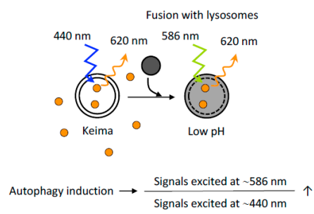 Keima是一種PH敏感型的熒光蛋白,其雙峰激發光譜依賴于周圍的pH值,在中性和酸性環境中分別在440 nm和586 nm處激活。Keima在中性和酸性pH中熒光信號不同的特性,可以直觀地反映細胞自噬程度。將細胞質的Keima傳遞到溶酶體可反映非選擇性細胞自噬,將Keima融合到特定的蛋白(如融合到線粒體靶向序列—mt-Keima,作為線粒體細胞自噬標記)可用于反映選擇性細胞自噬。值得注意是,基于keima的檢測不能在固定細胞中進行,因為這種檢測完全依賴于溶酶體的酸性。