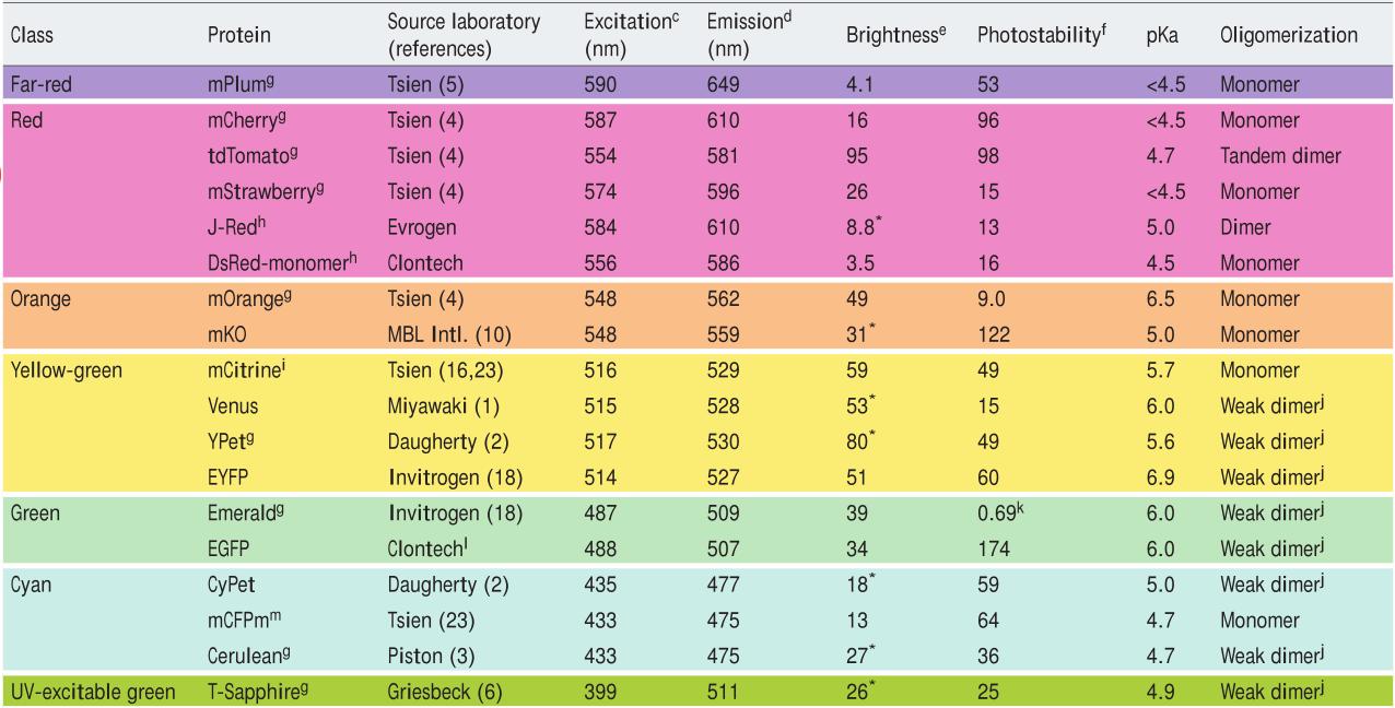 面對琳瑯滿目的(de)FPs,研究人員在具(ju)體(ti)科學研究中往往受到一(yi)系列問題的(de)困擾,如哪些(xie)FPs好用(yong)?哪些(xie)FPs亮度高?哪些(xie)因素影響理想FPs的(de)選擇(ze)?下面我們就從如下幾方面一(yi)一(yi)展開(kai)討(tao)論,旨在為大(da)家縮(suo)小(xiao)選擇(ze)范圍提(ti)供(gong)參考。