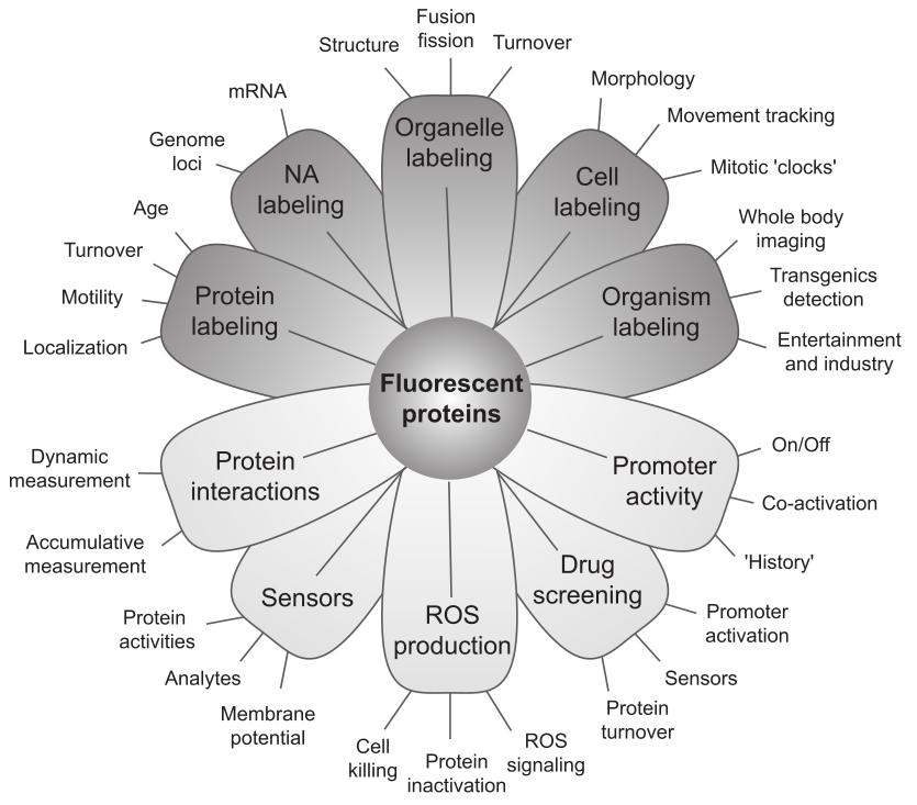 如(ru)今,FPs作為標(biao)記(ji)蛋(dan)白(bai)和(he)報告蛋(dan)白(bai)被(bei)廣泛應(ying)用(yong)于生(sheng)命(ming)科學研究(jiu)的諸(zhu)多領域(yu),以研究(jiu)生(sheng)命(ming)系統的組織和(he)功能(圖5)。