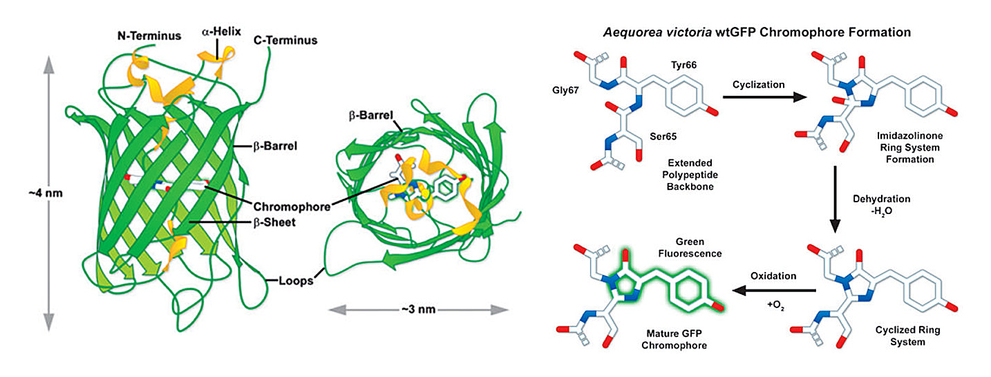 在(zai)1996年(nian),GFP的(de)晶體結(jie)(jie)構(gou)被(bei)科學家成(cheng)功(gong)解析:GFP是(shi)典型的(de)β桶形(xing)結(jie)(jie)構(gou),包括11條(tiao)β折疊和α螺旋:11條(tiao)β折疊緊密交織在(zai)一(yi)起形(xing)成(cheng)圓柱狀的(de)“柵欄”,α螺旋上的(de)第65、66、67位氨(an)基(ji)(ji)酸(suan)(suan)(絲(si)氨(an)酸(suan)(suan)、酪氨(an)酸(suan)(suan)、甘氨(an)酸(suan)(suan))位于其(qi)正(zheng)中位置(zhi),在(zai)分子氧的(de)作用(yong)下(xia),經過環化、脫(tuo)氫等作用(yong)最終形(xing)成(cheng)成(cheng)熟的(de)熒光基(ji)(ji)團(tuan),嚴密的(de)桶形(xing)結(jie)(jie)構(gou)保護著熒光基(ji)(ji)團(tuan),防(fang)止它被(bei)周圍環境(jing)淬滅(圖3a和3b);N端(duan)和C端(duan)均(jun)暴露(lu)在(zai)外面。