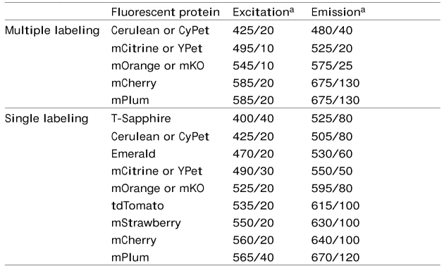 選擇FPs進行成像實驗時,所選FPs的光譜范圍需滿足實驗室現有成像設備的需求,畢竟重新購買成像設備成本還是比較高的。推薦使用的成像設備濾光片組合見表2。