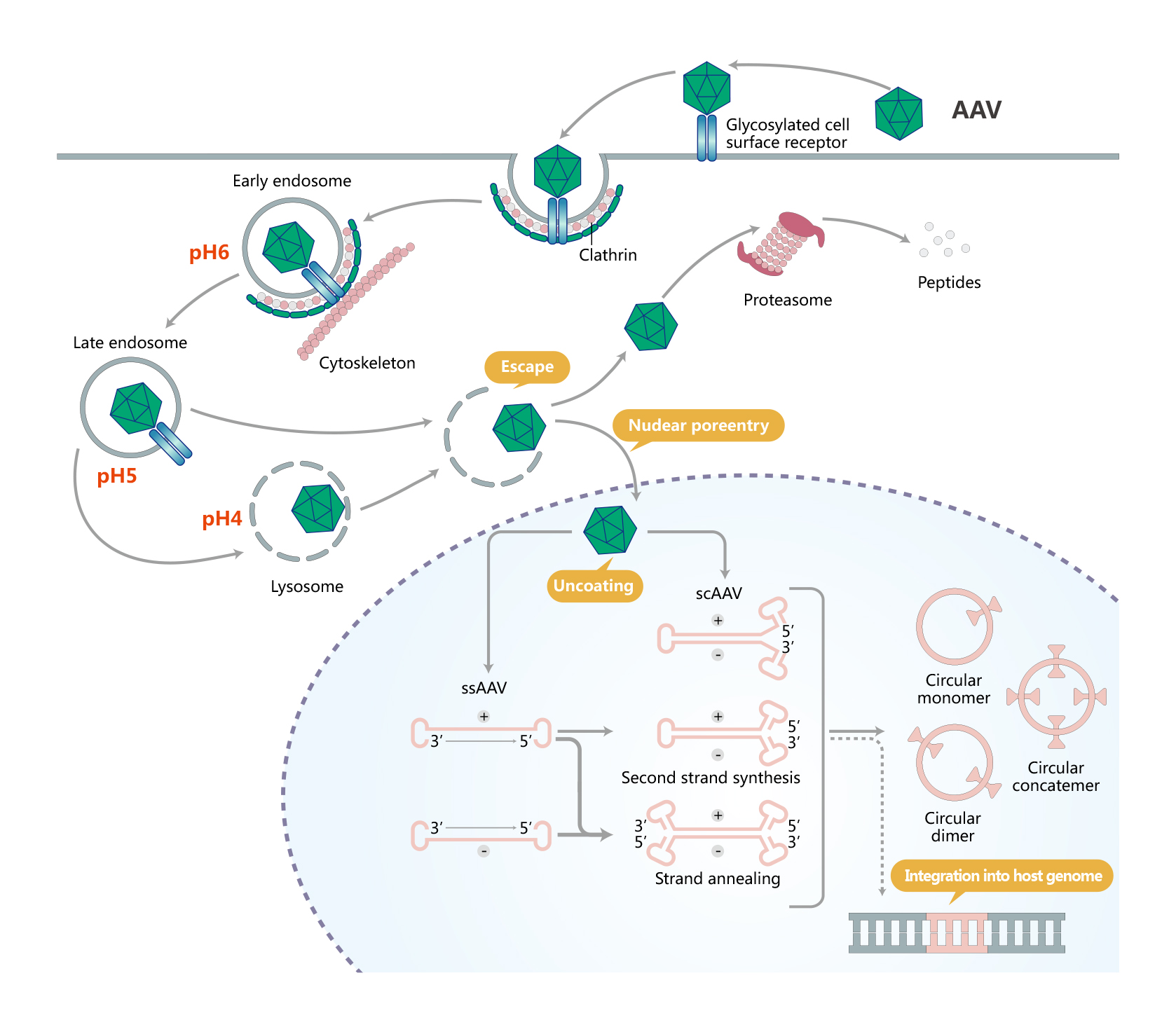 ssAAV和scAAV向(xiang)靶(ba)細(xi)胞中遞送外源基(ji)因的過(guo)程: