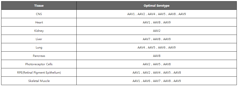 現階(jie)段研究人(ren)員已發現12種(zhong)人(ren)類(lei)AAV 血(xue)清(qing)(qing)(qing)型(xing)(AAV1至(zhi)(zhi)AAV12)和(he) 100多種(zhong)非人(ren)類(lei)靈長動物(wu)AAV血(xue)清(qing)(qing)(qing)型(xing)。下面(mian)列舉了人(ren)類(lei)AAV1至(zhi)(zhi)AAV9識別的(de)細胞表面(mian)受體及不同組織親嗜(shi)性,可(ke)根據(ju)組織類(lei)型(xing)選(xuan)擇(ze)(ze)合適的(de)AAV血(xue)清(qing)(qing)(qing)型(xing)。在選(xuan)擇(ze)(ze)血(xue)清(qing)(qing)(qing)型(xing)時,盡量選(xuan)擇(ze)(ze)對靶組織和(he)細胞有更高特異性和(he)轉導(dao)效率的(de)AAV。