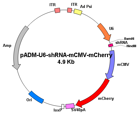② 250μl DMEM和1μg穿梭質粒、2μg包裝質粒(即腺病毒骨架質粒),配成Mix2。