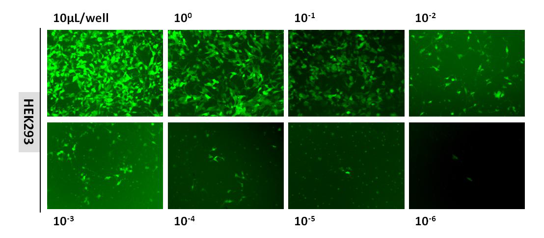 孔稀釋法是通過數熒光的方法測定慢病毒滴度,得到的結果為有感染能力的慢病毒顆粒數。下圖是維真某慢病毒(3.20×108TU/mL)孔稀釋法測滴度時的熒光圖: