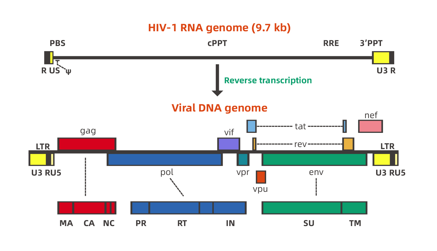 慢病毒含有復雜的基因組。以HIV-1(人類免疫缺陷I型病毒)為例,HIV是一種單鏈RNA病毒,其基因組長度約為9.7kb。基因組兩端各有一個反向末端重復序列(inverted terminal repeat, ITR),中間包括gag、 pol、env 3個結構基因及tat、rev、nef、vif、vpr、vpu 6 個調節基因。下圖是HIV-1基因組的示意圖: