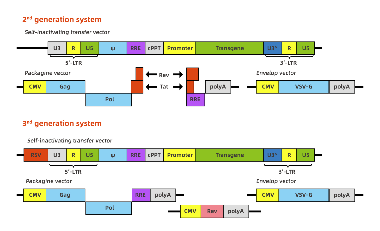慢病毒的宿主范圍比較廣,既能感染分裂細胞,也能感染非分裂的細胞,在體內外研究中均可選擇慢病毒作為病毒載體。此外,慢病毒也是構建穩轉株的理想病毒。