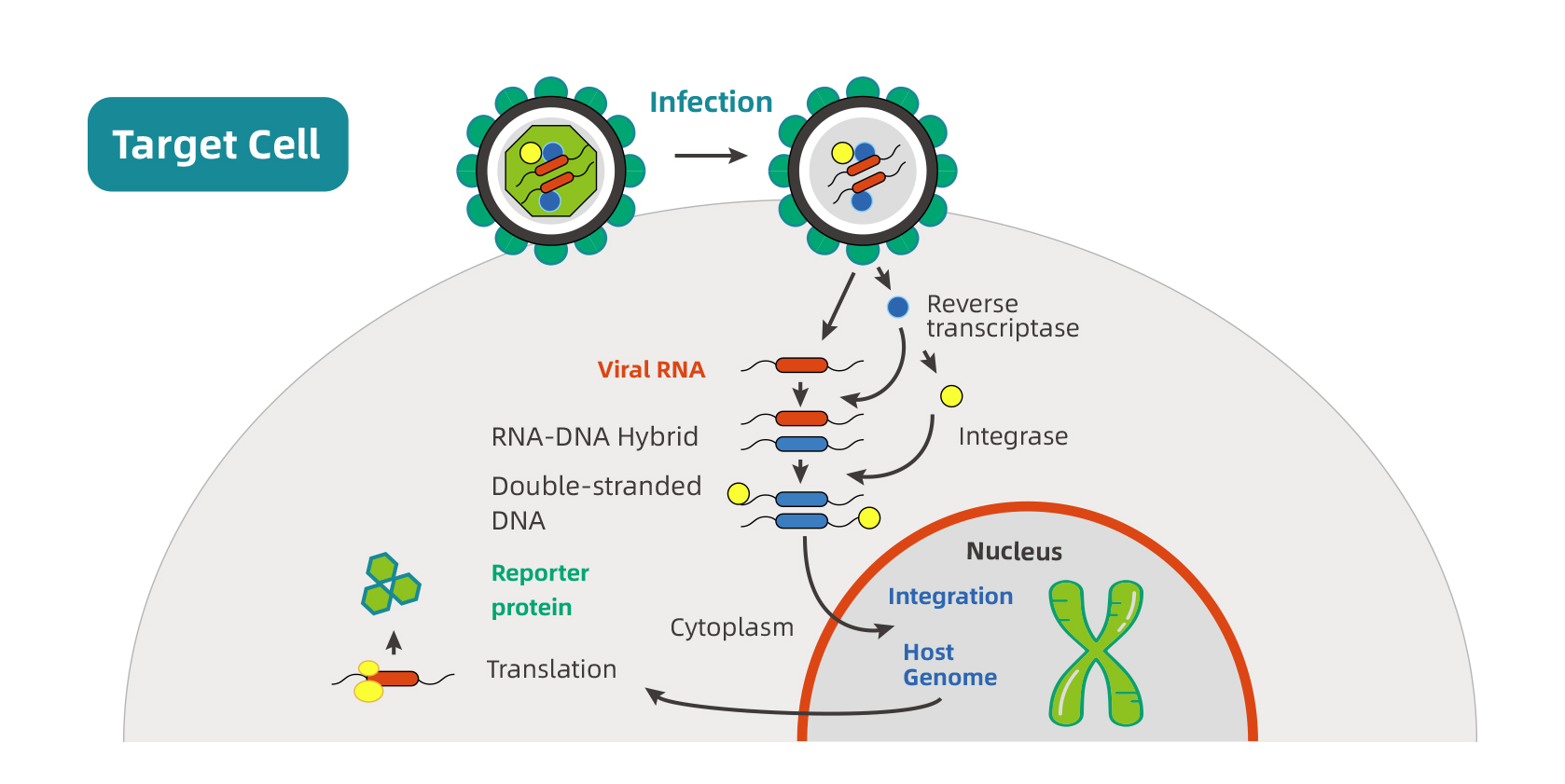慢病毒感染細胞的第一步是通過包膜蛋白與細胞表面受體結合。慢病毒與宿主細胞膜融合后釋放結構蛋白、酶蛋白和病毒核心。病毒RNA在逆轉錄酶的作用下逆轉錄并與整合酶形成整合前復合物。整合前復合物進入細胞核后,整合酶催化其整合至宿主基因組。外源基因前啟動子驅動其在細胞質中表達。 下圖是慢病毒感染細胞的示意圖: |