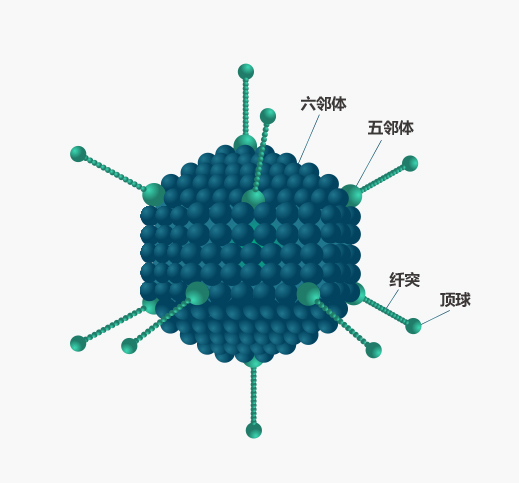 腺病毒是一種直徑為90-100nm的病毒顆粒,衣殼呈廿面體,由240個六鄰體和12個五鄰體組成。以五鄰體蛋白為基底由衣殼表面伸出12根纖毛,纖毛頂端形成頭節區。五鄰體和纖毛的頭節區可與細胞表面的受體結合,在病毒感染細胞過程中起著非常重要的作用。右面是腺病毒的結構示意圖: |