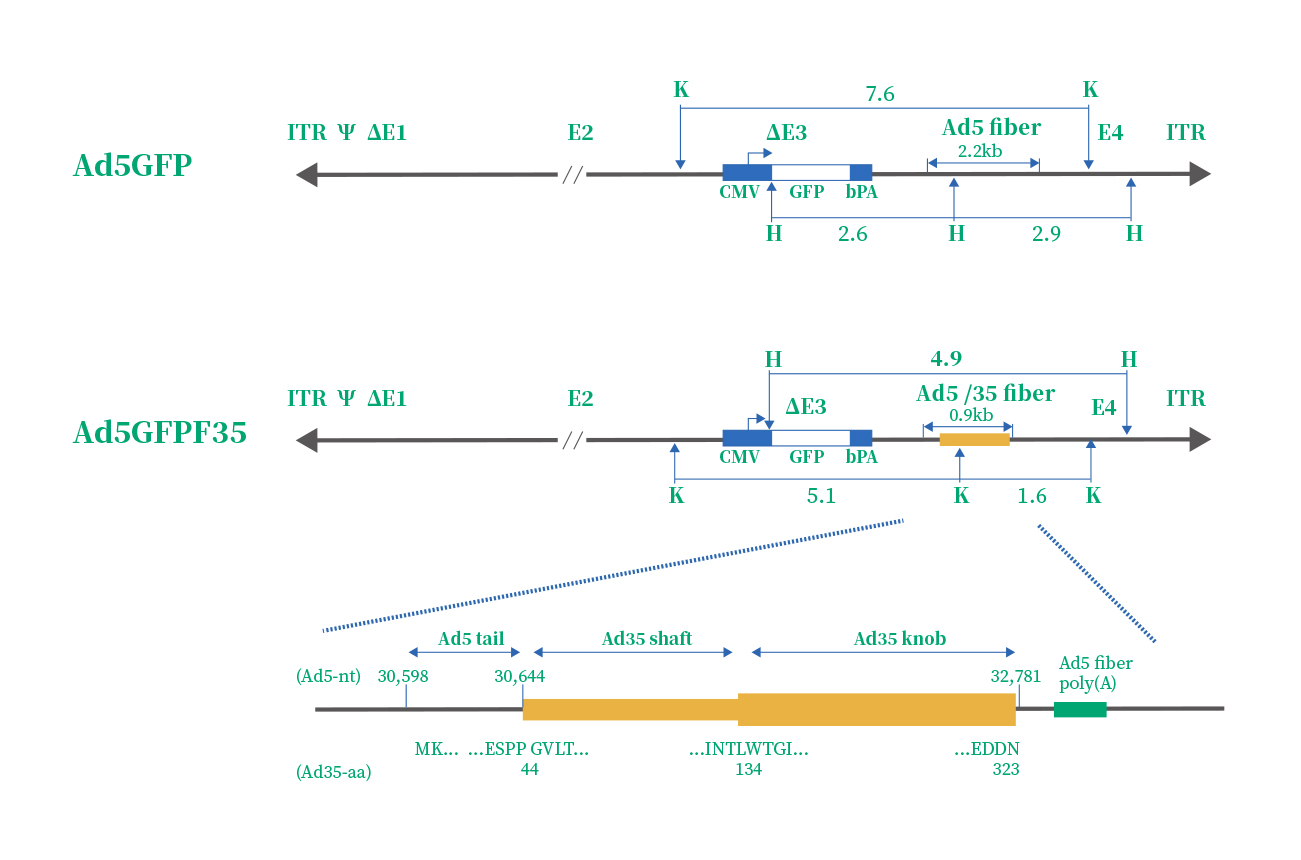 一個嵌合型腺病毒載體,主要結構是在AdV5的基礎上,其受體結合位置的纖突(Fiber)改造成了F35型腺病毒(F35)的纖突(纖毛蛋白的Knob和shaft)。其細胞受體從AdV5的CAR變成了CD46,其他的基因仍舊保留AdV5載體的特性,能有效轉導CAR表達不足的多種重要靶細胞,尤其是對腫瘤細胞及造型干細胞、間充質干細胞等有較高的感染效率。