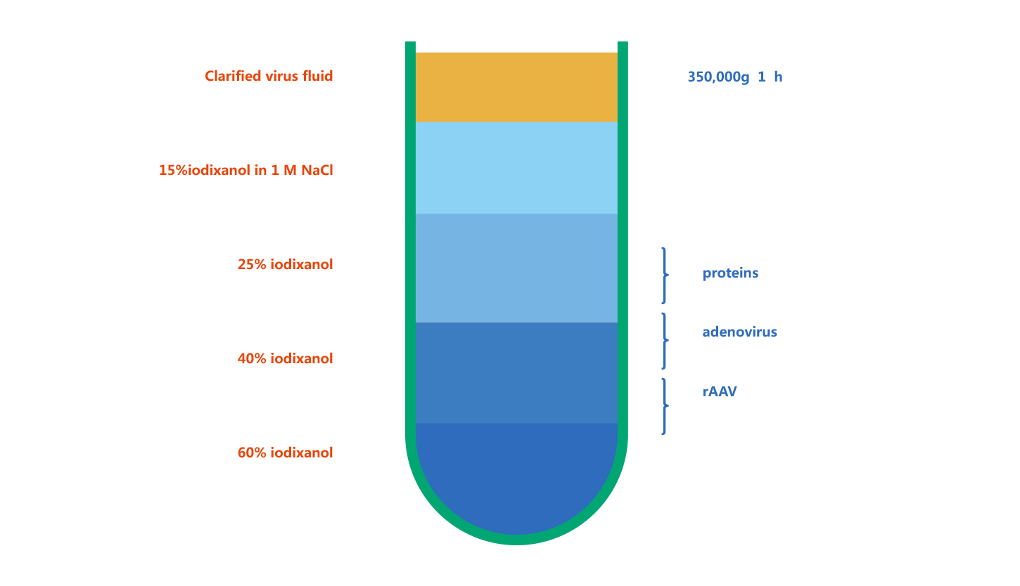 維真生物采用碘克沙醇密度梯度超速離心法對AdV病毒進行純化。碘克沙醇是一種造影劑,已接受了臨床檢驗。它具有非離子型、對細胞無毒和代謝惰性等優點。現在在病毒純化方面應用廣泛。它利用不同顆粒之間存在的沉降系數差,在一定離心力作用下,顆粒各自以一定速度沉降,在密度梯度不同區域上形成區帶。下圖是AdV病毒純化后的示意圖: