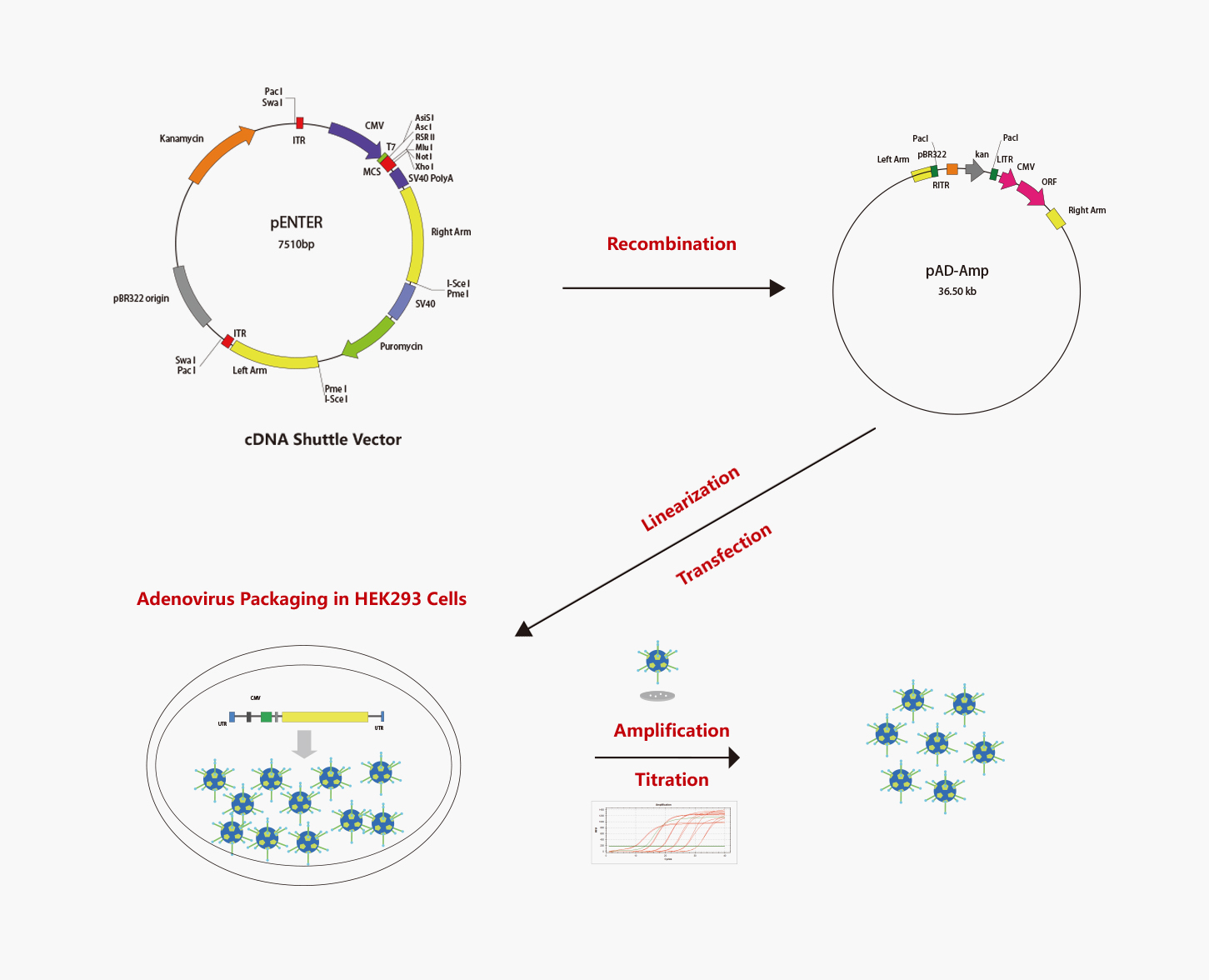 維真生物可以提供從腺病毒(AdV)質粒設計、構建、包裝到表達分析的所有服務外包項目。而且,維真生物全套的腺病毒載體和表達系統可用于體內和體外表達human/mouse/rat ORFs,lncRNA,circRNA,shRNAs和CRISPR/gRNA。維真生物生產的腺病毒具有滴度高、純度高和穩定性高的三高優點。下面是腺病毒從頭合成的流程: